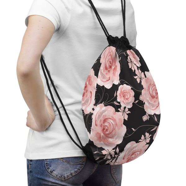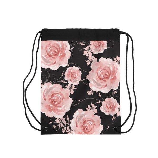 Drawstring Bag-Pink Rose-Pink Stencil-Black