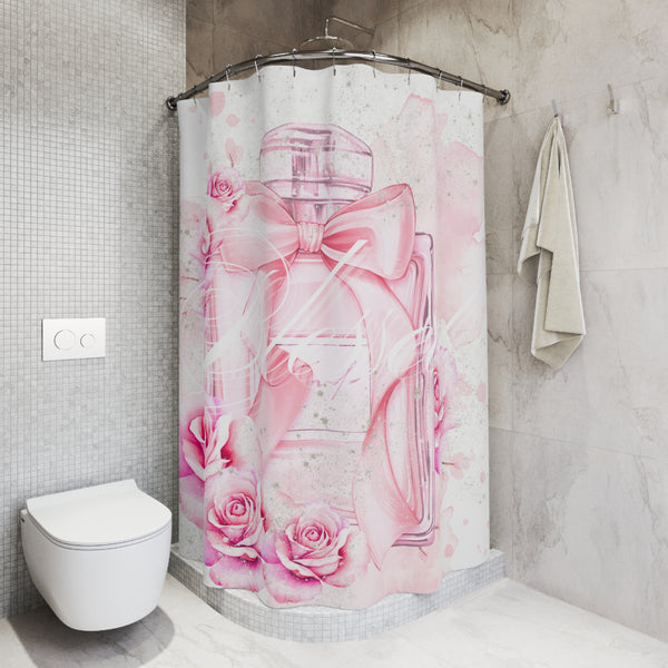 Transform your bathroom into a couture retreat with the Blessed Blush & Roses Perfume Bottle Shower Curtain. Featuring a watercolor perfume bottle wrapped in a soft pink bow surrounded by blooming roses, this piece radiates feminine grace and luxury. This design combines romance and modern glam for the perfect statement piece.