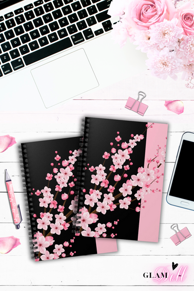 Spiral Notebook (Small) - Pink Floral Blossoms - Black & Pink